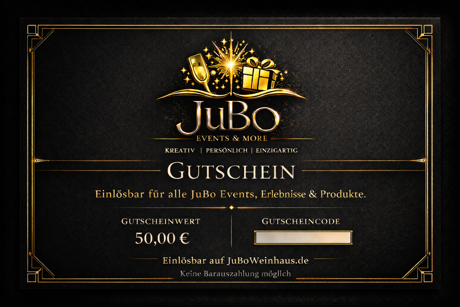 Der JuBo Wertgutschein ist das perfekte Geschenk für alle, die Freude, Genuss und besondere Erlebnisse verschenken möchten. Einlösbar für Events, DIY-Sets, Brunch, Wein und viele weitere Produkte auf JuBoWeinhaus.de. Nach Zahlung direkt per E-Mail verfügbar und sofort verschenkbar.