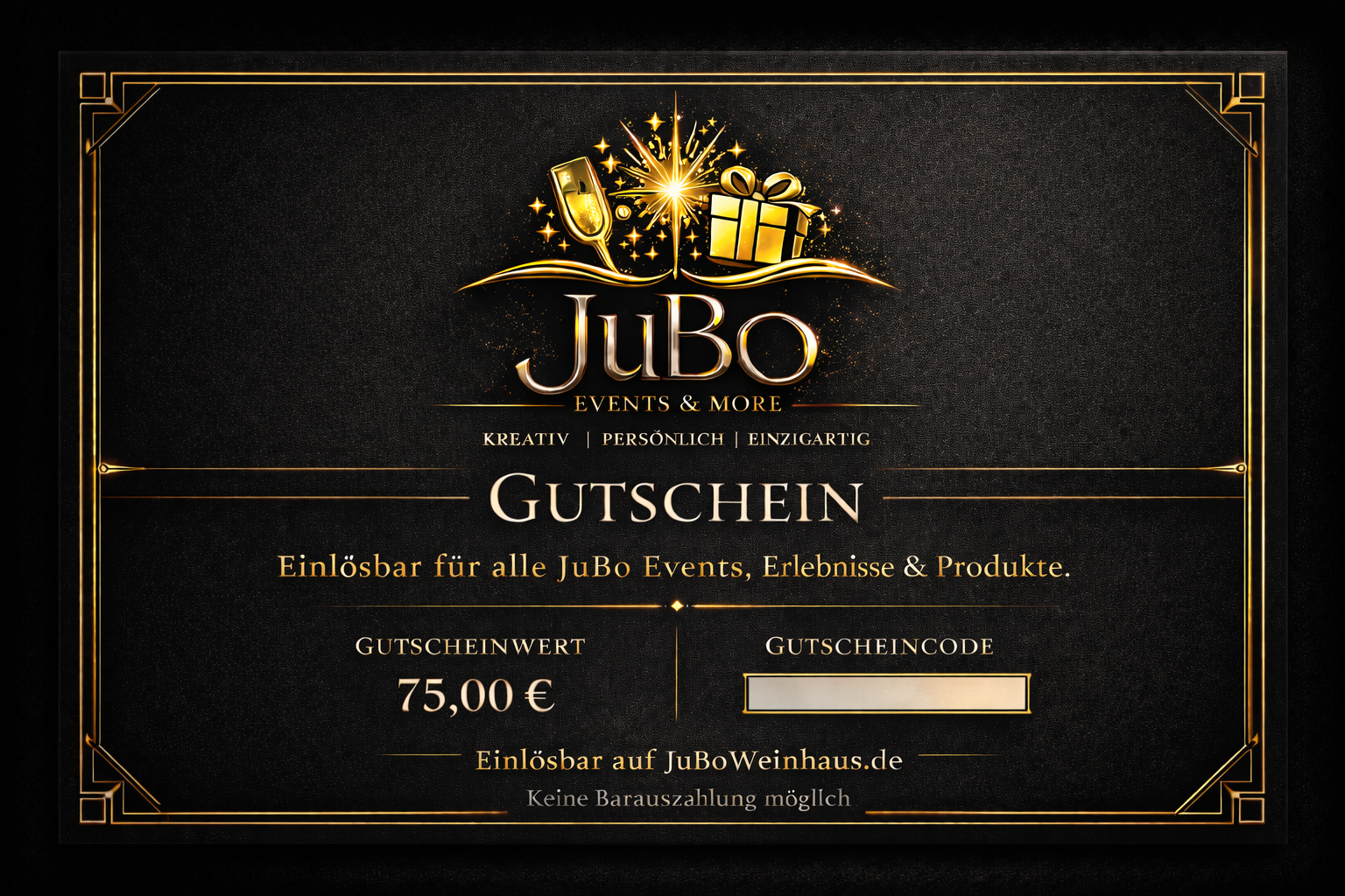 Der JuBo Wertgutschein ist das perfekte Geschenk für alle, die Freude, Genuss und besondere Erlebnisse verschenken möchten. Einlösbar für Events, DIY-Sets, Brunch, Wein und viele weitere Produkte auf JuBoWeinhaus.de. Nach Zahlung direkt per E-Mail verfügbar und sofort verschenkbar.