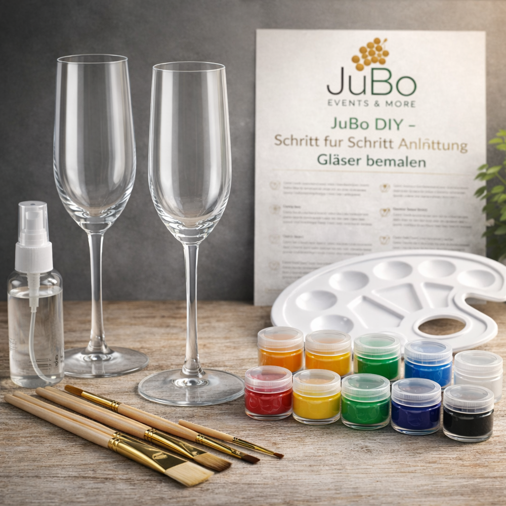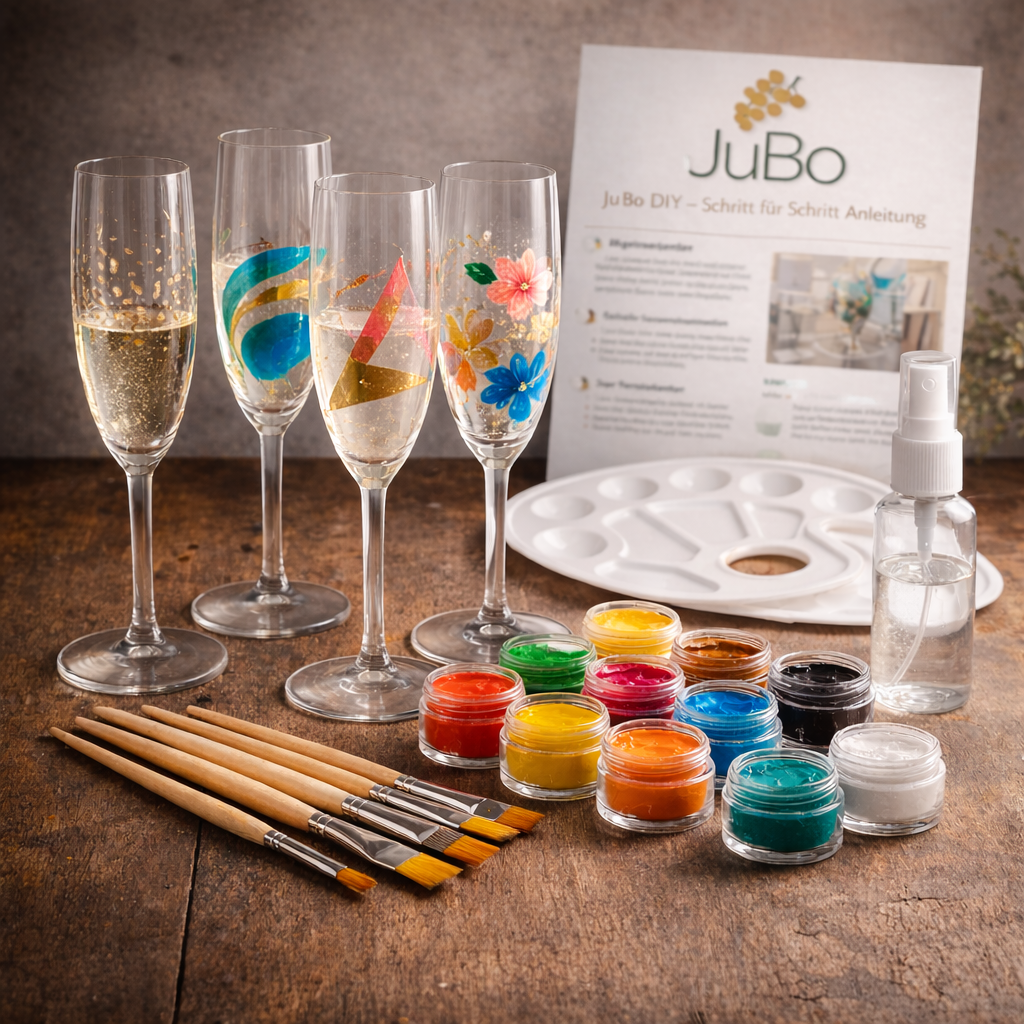 Mit dem Sektgläser bemalen Set von JuBo DIY, verwandelst Du schlichte Gläser in echte Unikate. Egal ob für einen kreativen Abend allein, ein gemütliches Treffen mit Deinem Lieblingsmenschen oder als besonderes Geschenk – unser Komplett Set bietet Dir alles, was Du brauchst, um sofort loszulegen. Dank der enthaltenen Schritt für Schritt Anleitung ist das Set absolut anfängerfreundlich – keine Vorkenntnisse nötig.