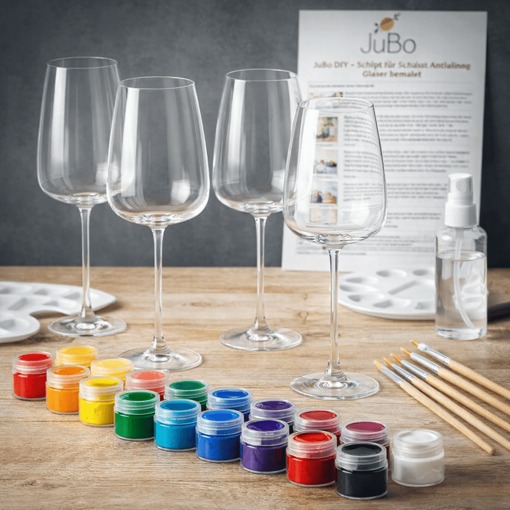 Mit dem Weingläser bemalen Set von JuBo DIY, verwandelst Du schlichte Gläser in echte Unikate. Egal ob für einen kreativen Abend allein, ein gemütliches Treffen mit Deinem Lieblingsmenschen oder als besonderes Geschenk – unser Komplett Set bietet Dir alles, was Du brauchst, um sofort loszulegen. Dank der enthaltenen Schritt für Schritt Anleitung ist das Set absolut anfängerfreundlich – keine Vorkenntnisse nötig.