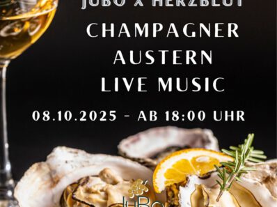 🥂 Prickelnd. Fein. Unvergesslich. Feinschmecker aufgepasst: Im JuBo Weinhaus wird’s edel!Erlebt einen Abend voller Geschmack, Musik und prickelnder Atmosphäre. 🦪 Frische Austern & feine Häppchen – direkt an unserer Bar serviert🍾 Champagner & ausgewählte Weine – unsere Highlights aus dem Keller🎶 Live-Musik – dezente Grooves für die perfekte Stimmung Standard Ticket (29€) beinhaltet: Inklusive 3 Austern + 1 Glas Champagner Deluxe Ticket (49€) …